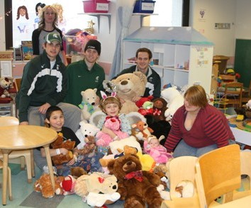 Fans threw the bears onto the ice after the first Spartan goal during the team's Jan. 14 game against Northern Michigan University. Senior defenseman AJ Sturges, Forward Justin Hoomaian and Center Brett Perlini visited the playroom and played with the children today.