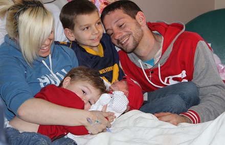 Mom Ashley, brothers Zayden (16 mos.) and Skyler (8 yrs.) and dad Patrick welcome little Charlee to the family at Sparrow's Mother Baby Center.