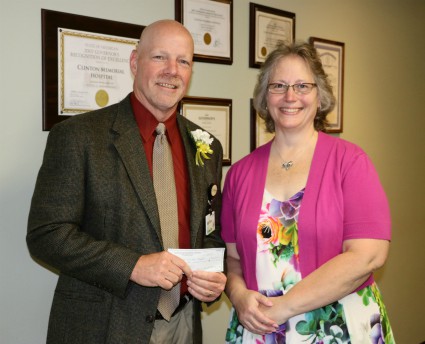 Outgoing President Angie Beals was honored during a recent meeting for her service as co-president from 2015-17. Beals also presented Sparrow Clinton Hospital Vice President and Chief Financial Officer Mark Brisboe with a check for $20,000, which goes toward the Auxiliary’s $100,000 pledge to fund construction of the hospital’s Emergency Services Department. The renovated Department is about to celebrate its third anniversary of providing timely access to emergency and trauma care.