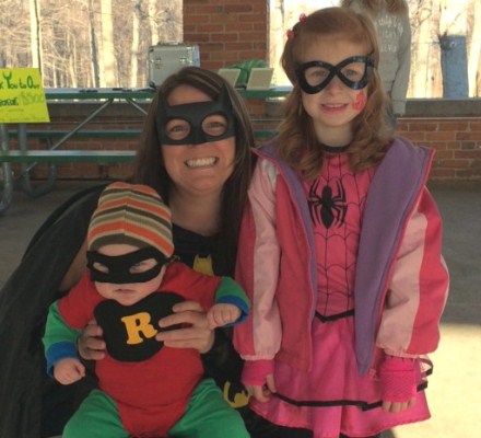 Batgirl Carry Felton with Baby Robin Marcus and Spidergirl Morgan. Carry works in SCH Reception.