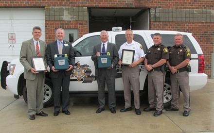 (l to r) Jason Eppler, Sparrow Ionia Hospital Foundation President; Bill Roeser, Sparrow Ionia Hospital CEO; Steve Edmondson, D.O., Saranac Physician; Ionia County Sheriff Dale Miller; Deputy Brent Denny and Sgt. Stan Hoskins.