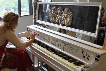Sparrow’s piano bears classically imagined cherubs and angels. The inside of the key cover bears Klein’s theme for the piece: “Allow your passion to become your purpose and it will one day become your profession.”