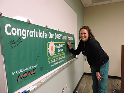 Sparrow Ionia Hospital DAISY Award winner Catharina Green, RN, signs the DAISY banner at the hospital.