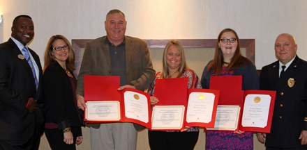 (from left) Sabarras George, Executive Director Strategic Wellness at the MAC, Vicki Hamilton-Allen of the American Red Cross, Lifeguards Robert Murphy, Jane Wallenwine and Theresa Bodwin, and Meridian Township EMS Chief Bill Priese