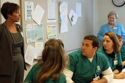 Sparrow Interim Executive Director of Nursing, Christine M. Jodoin, MSN, RN, NE-BC (left) and Elizabeth Henry, Senior Vice President/Chief Nursing Officer (far right) greet incoming MSU BSN students as they are paired up with Sparrow Nurse preceptors for the next term.