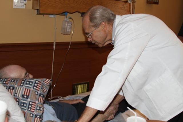 Sparrow Caregiver and Vietnam War veteran Jim Mandeville shakes the hand of fellow veteran, William H. Cunningham, who is a Patient at the Hospice House of Mid-Michigan.