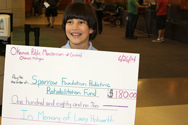 Students from Okemos Public Montessori at Central presented a $180 check to the Sparrow Children's Center Thursday in honor of Lacey Holsworth. Shown during the
