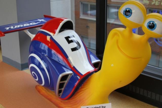 "Turbo" the snail is a new member of the colorful glassed-in hallway of the Sparrow Children's Center, thanks to Celebration! Cinema in Lansing. Celebration! has