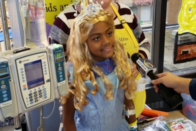 Lianda Castilla-Boyer, 7, and Kristina Mattone of Spirit Halloween are interviewed during Spirit Halloween’s annual party for Patients at the Sparrow Children’s
